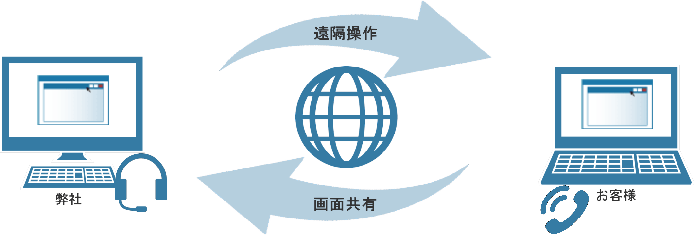 リモートサポートとは、お客様が弊社のソフトウェアに関することでお困りの際に、サポート担当者がお客様のPC及びサーバをインターネット経由で接続し、遠隔操作でサポートを行うことをいいます。