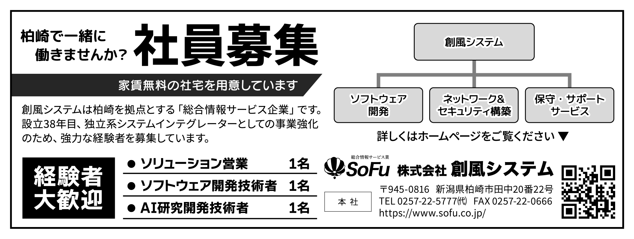 | 仕事の内容 | ソフトウェア開発業務の高度化に伴うAI技術研究員の募集です。 現在、下記の独自開発システムを社内で検証し、 一部顧客への提供を開始しています。 SoFu ERP:中小企業向け 総合情報分析システム SoFu DCS:中小企業向け データセンター・サービス SoFu GPT:社内向け 対話型AIシステム 顧客のニーズが高度化する中、さらなる商品・サービスの向上を目指し、 情報開発業務への挑戦と楽しさを共に分かち合える仲間を募集しています。 ※変更範囲:会社が定める業務 |