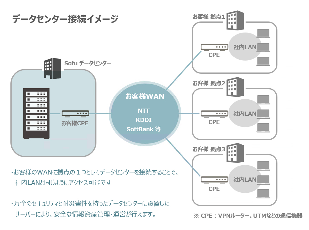 SoFuデータセンターサービスでは、お客様のネットワーク環境に合わせて接続構築し、